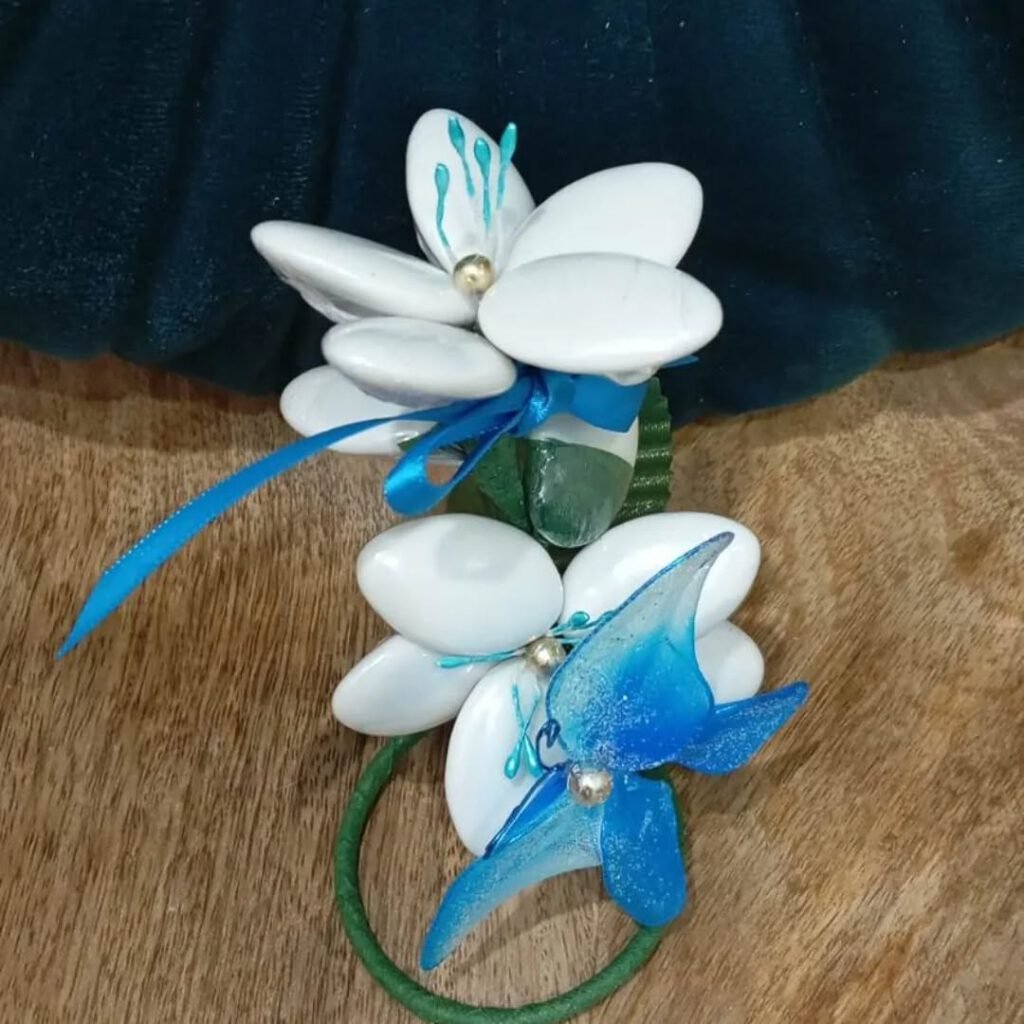 Cette composition délicate comprend deux fleurs en dragées blanches, chacune composée de cinq pétales. Les fleurs sont accompagnées de deux papillons bleus créés en nylon, apportant légèreté et mouvement à l’ensemble. Un ruban satin bleu de 15 mm orne la base des fleurs, ajoutant une touche de couleur et de raffinement à cette pièce élégante et simple.