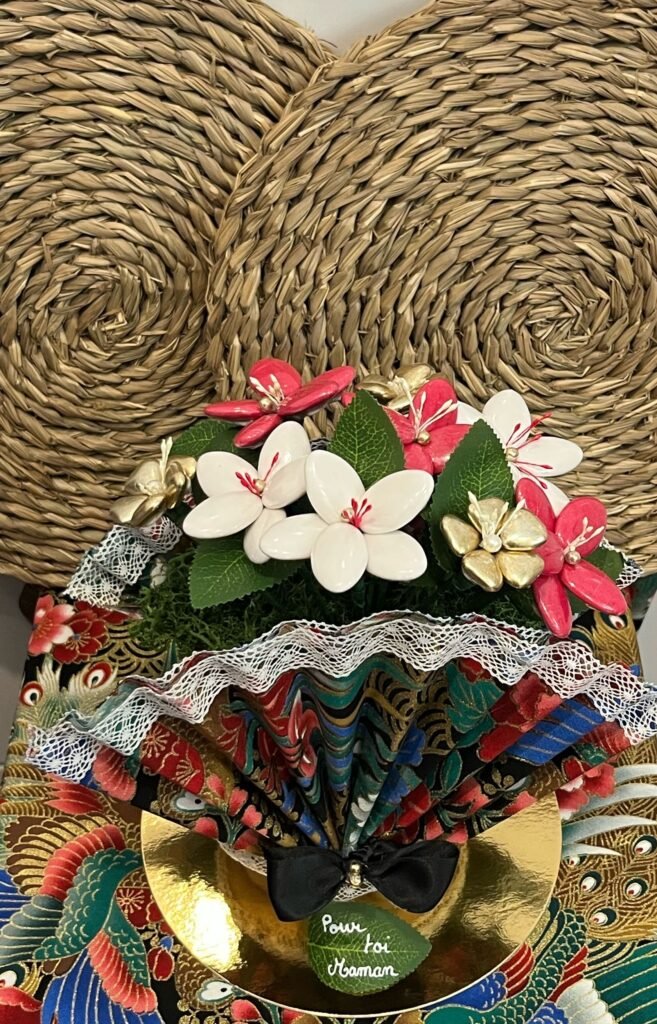 Cette éventail, ode à la féminité. Tissu japonais brodé, dentelle fine et fleurs aux couleurs chatoyantes (fuchsia, blanc, Or) s’entrelacent dans une harmonie parfaite. Des feuilles artificielles et un ruban noir délicat apportent une touche finale à cette création unique présenté sur un rondin de bois naturel. Un cadeau inoubliable pour célébrer l’amour maternel.