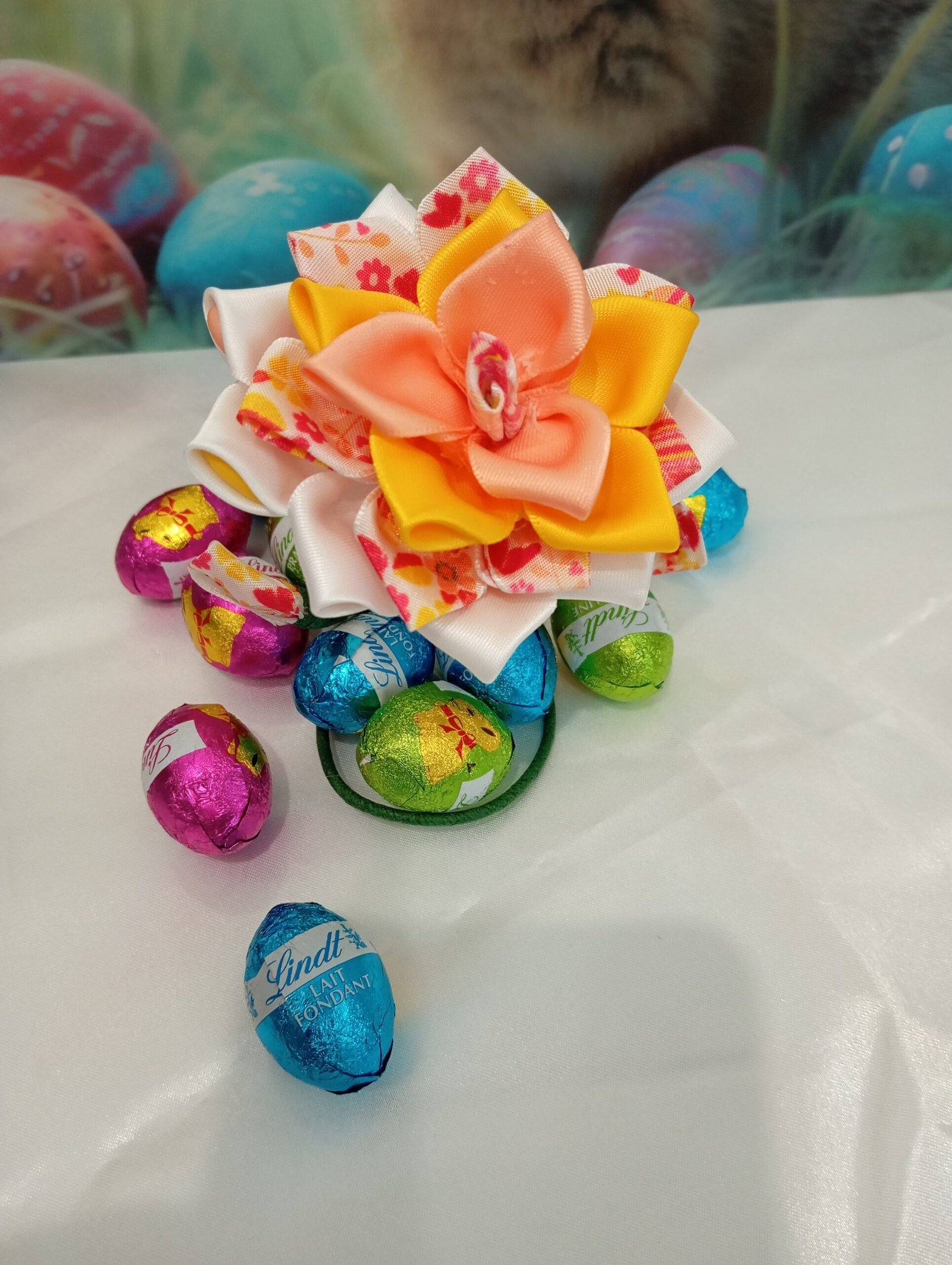 Une fleur en satin aux couleurs douces de Pâques (blanc, jaune, saumon) abritent en leur cœur de délicieux mini cœurs en chocolat, subtilement cachés entre les pétales. Leur tige tournicotée permet de les faire tenir debout, comme de véritables fleurs de printemps. Une création ludique et gourmande pensée pour les enfants, qui seront ravis de découvrir les douceurs bien dissimulées — comme une chasse aux œufs, mais en version florale !