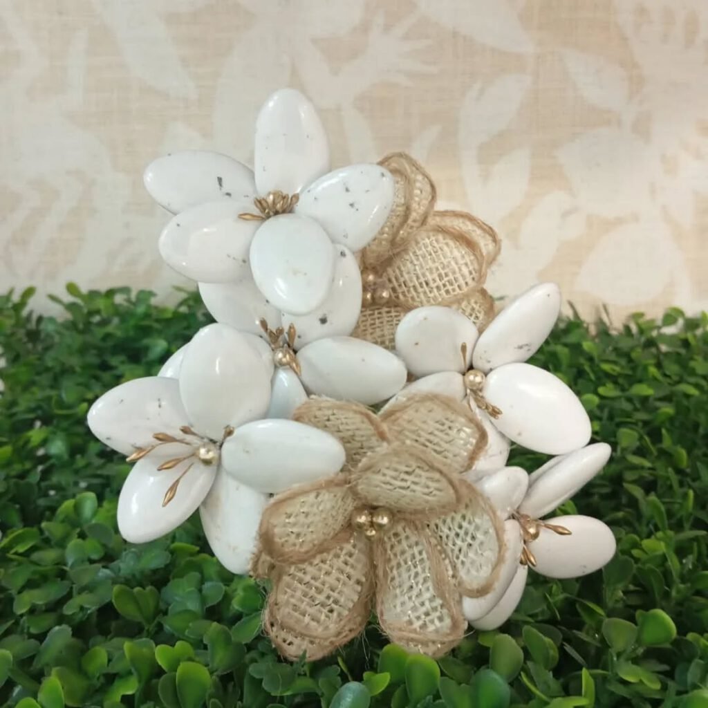 Aujourd’hui, je conçois à la main des fleurs de dragées personnalisées, pensées pour embellir chaque événement. Chaque pièce est unique, façonnée avec amour, souci du détail et respect des envies de mes clients. La personnalisation est au cœur de mon travail : je prends soin de choisir des matériaux adaptés à chaque besoin, y compris pour les enfants, afin de garantir sécurité et qualité.